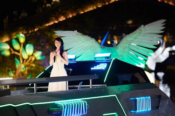 船是流动的舞台。歌手黄英、蔡淳佳、海伦轮番登上赛博朋克风格的炫彩游船,带来《不要慌太阳下山有月光》《茉莉花香》《桥边姑娘》等热门歌曲,一张视听结合的江南水墨3D画跃然纸上!